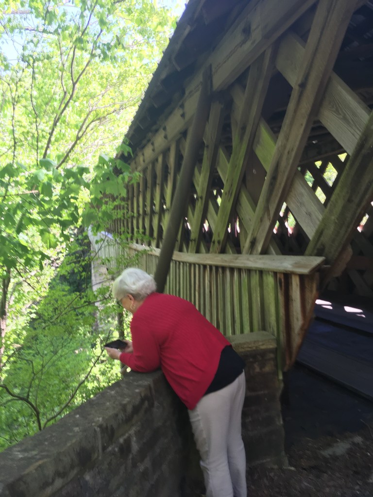 “Okay,” I said. “I will do a video of you doing it.” I walked and videoed, while TOR drove at the 5-mph speed limit through the bridge, with Gracie by her side. I couldn’t see much through the wooden slats and thick green spring foliage, but there was water beneath the bridge. I wonder if TOR would have made her heroic drive had she known that this bridge, which spans the Calvert Prong of the Little Warrior River, is 70 feet!!! above that prong. In fact, according to several sources, this bridge is the HIGHEST covered bridge over any US waterway. She was proud of her accomplishment, even more so after she looked down over the edge on the other side and saw how far below the water was. This bridge was built in 1934, which surprised me. I always thought covered bridges belonged entirely to horse and buggy days.