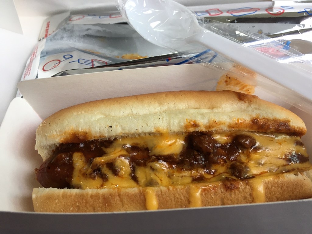We ordered decadent and messy chili cheese dogs, requesting knives and forks to go with, but in these somewhat post-Covid days, forks are apparently in short supply. We got knives and long-handled milkshake spoons. The all-beef dogs were pretty good, but trying to saw off bites and pick them up with those spoons was awkward. Bobby had ordered tater tots and a small cup of Ranch dressing (a condiment he believes goes well with just about anything edible). Normal fries you could pick up and dip, but tiny tots were difficult with no fork.