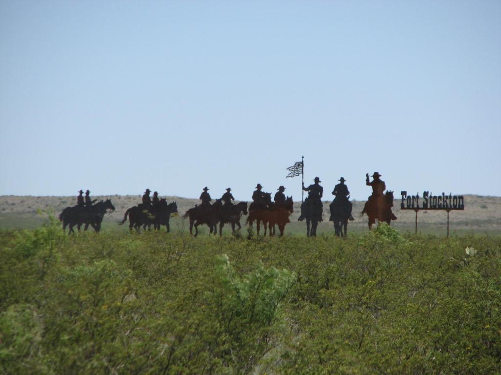 The east and west approaches to Fort Stockton (south of I-10) feature large, striking sculptures in silhouette by New Mexico artist Brian Norwood. The eastern installation depicts Buffalo Soldiers riding two by two behind their Guidon as they approach Fort Stockton. (I had to look up the word “Guidon,” so I will save you the trouble. It is a pennant that narrows to a fork at its free end.) The western installation represents a small Comanche hunting party pausing to search for buffalo.