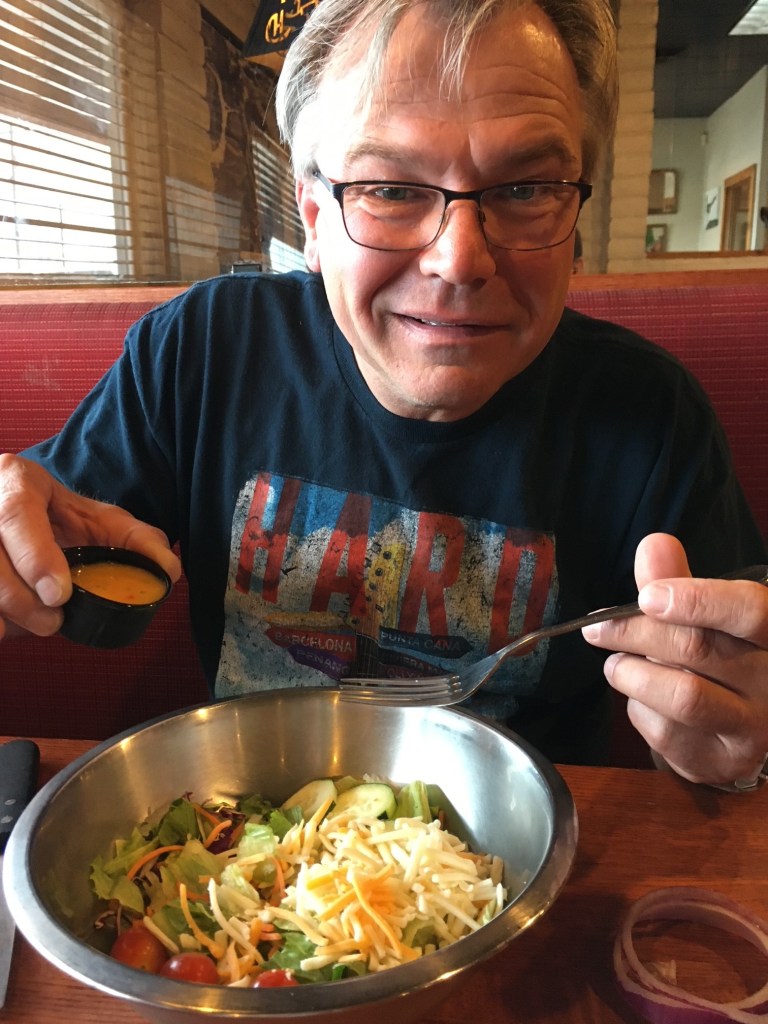 Before arriving in Fort Stockton, we did an Internet search for local restaurants and settled on K-BOB’s, which described itself as serving “authentic, made-from-scratch lunch and dinner” not only to hungry travelers but also to the town’s high school sports teams and crews coming into town from “the ranch, the rig, or the factory floor.” K-BOB’s didn’t disappoint. We ordered meatloaf, which was as delicious as my mother’s version right down to the chili sauce baked on top. I asked our server how the green beans were fixed (picturing canned in salty water), and she assured me they were picked fresh, then steamed. Yum. Bobby ordered a salad (with a side of Ranch, of course), and that’s when we discovered that westerners frequently serve salads in large, stainless steel, doggie bowl-looking things.