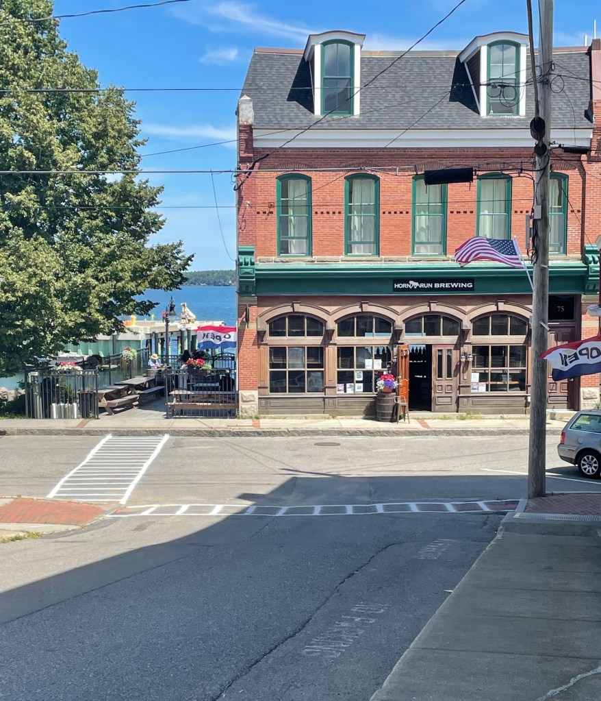 Next morning when we set out on the harbor footpath for a bayside breakfast, Roger and Meredith (R&M) took the spray-painted sentiment on one granite boulder personally. (See below.) Then we settled in on the back deck of the WaCo diner for a late breakfast while Gracie napped under our table. The WaCo opened in 1924, qualifying it as the oldest diner in Maine. It’s been in this same location for more than 80 years. Locals refer to it as “the Whacko.” Whatever, the menu is wonderful, including great breakfast fare, fresh-caught haddock, lobster, and other sea delights. My wild blueberry pancake stack came with six!! sausage links, so I had to share.