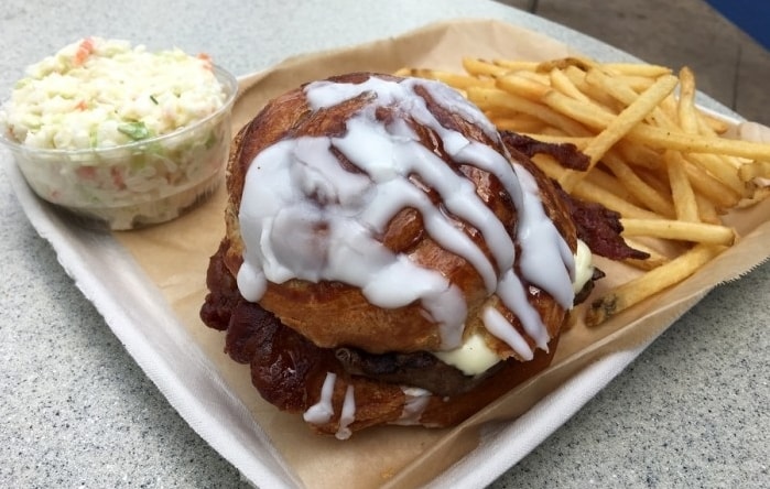 It turns out, a Cinnamon Roll Burger can be had in Florida as well as Nebraska. On your next DisneyWorld trip, locate the All-Star Movies resort on premises, head for the World Premier Food Court, corner a cast member at the ROXY counter, and whisper that you’d like to see the “secret” menu. You will then be handed an old-fashioned Viewmaster. (You’re as old as me if you remember those!) With it, you can order such “gourmet” items as a bacon ‘n mac ‘n cheese dog, poutine (a famous Quebec “delicacy” I can’t bring myself to describe) or the Cinnamon Roll Burger—this one made with white American cheese (whatever that is) and candied (??) bacon.