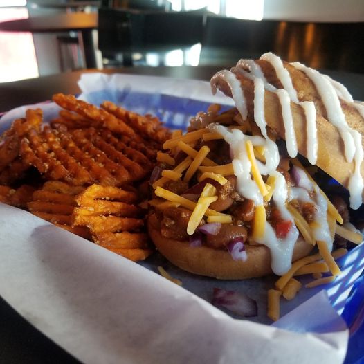 A large round table made for easy conversation, and the menu ran the gamut among burgers, salads, bar food, flatbreads, wings, and pizza. Though I didn’t order it, I was intrigued by one item on the menu that I’d never come across before. The Threeway Chili Burger sounded normal enough until I read the description—“Topped with house chili, cheddar & diced onion and—get this—served on a warm cinnamon roll with cream cheese icing.” Apparently, this unusual combination is quite popular in the area. Right below it on the menu was the “Fat Elvis,” a concoction of peanut butter, grape jelly, bacon, and a fried banana.