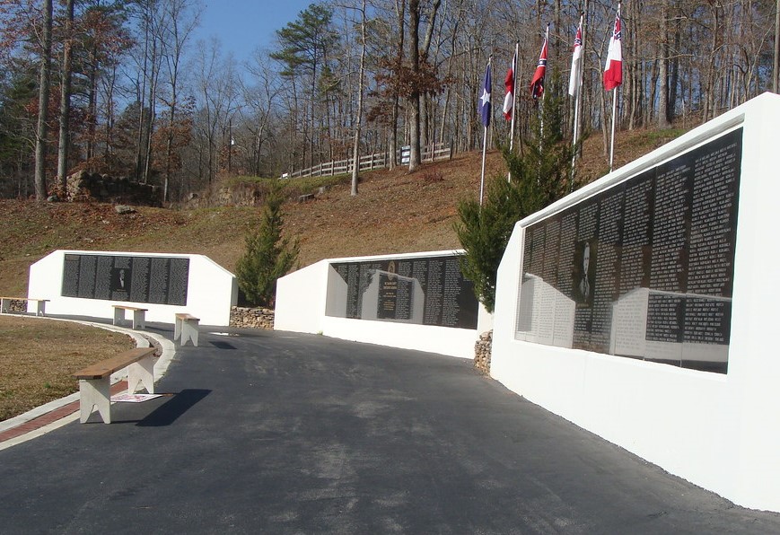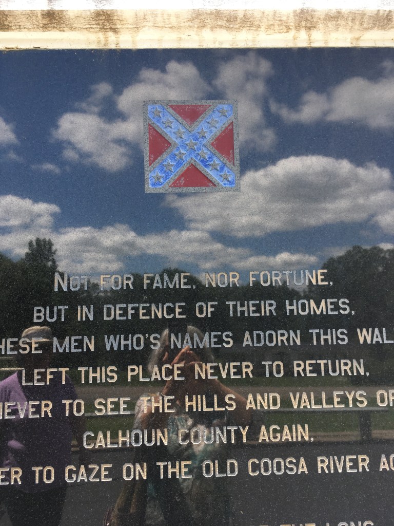 Who would guess that the world’s largest black granite Confederate States memorial (Are there other smaller black granite ones?) could be found way off the beaten path in Calhoun County, Alabama? But there it was, right next to the furnace chimney, looking a little like a smaller version of the Vietnam War memorial in Washington, DC., which was dedicated in 1993. This memorial was completed ten years later, but the idea dates back to 1994 when Charles Brown and other members of Tige Anderson Camp #453 of the Sons of Confederate Veterans visited Shiloh National Battlefield Park in Hardin County, Tennessee, and viewed the final resting place of Confederate States soldiers killed during the horrific Battle of Shiloh in April 1862. Most were buried in mass graves with no identification, so the Calhoun County visitors decided to go home and develop a memorial to ALL men from their county who served during the Civil War. Their memorial was finally dedicated in June 2003.