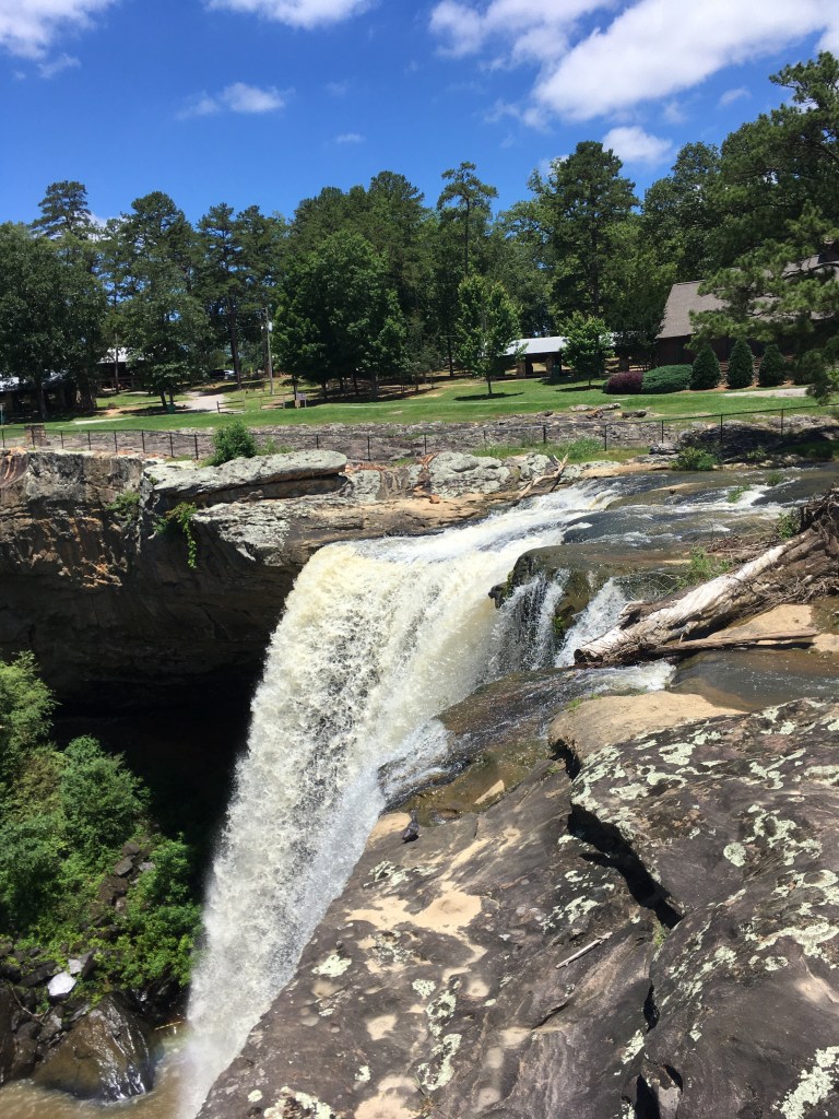 We’d had enough rain recently that the falls were falling loudly enough to hear them when we got out of the car in the second parking lot. I’d read that, sometimes, in dry weather, Noccalula Falls is only a trickle. Not today–plenty of greenish-white water rushing beautifully and noisily down over the rocks when we crossed the footbridge and reached the railing next to the bronze sculpture of Princess Noccalula.