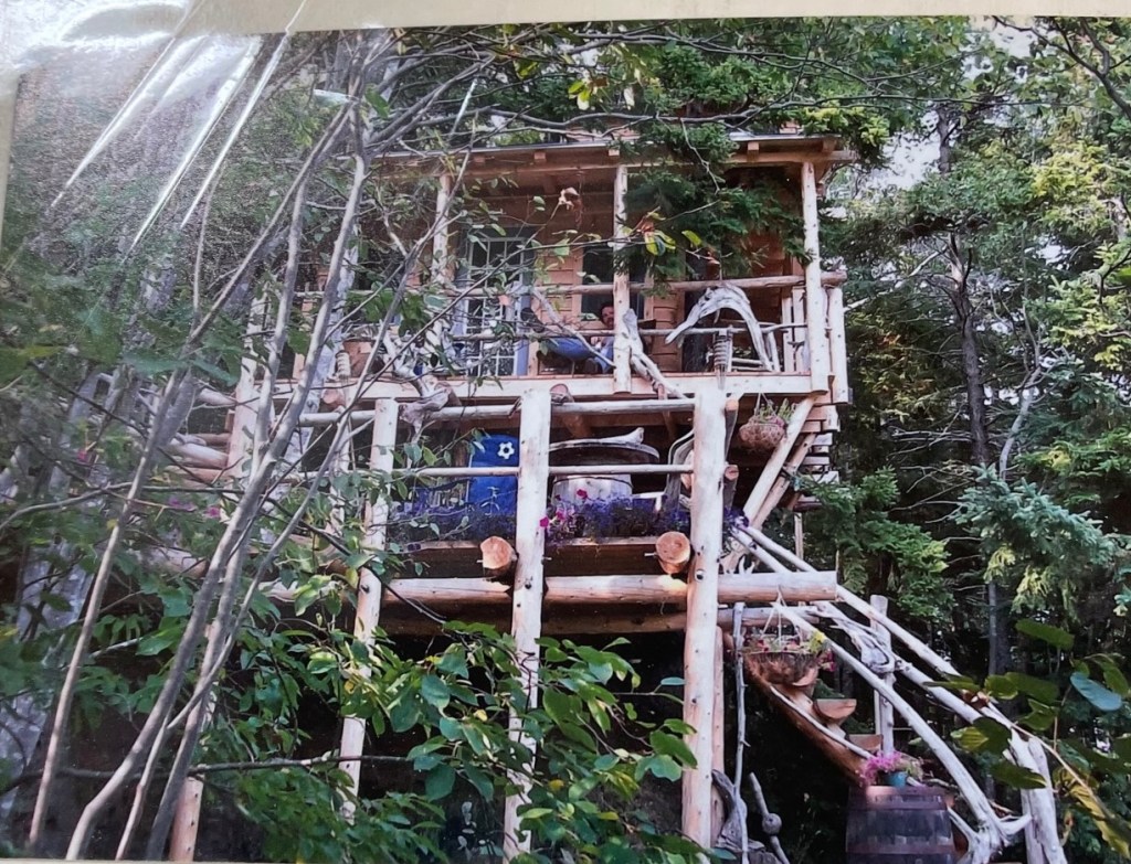 Without the photos, we might have doubted some of the tales he told us over the next half hour, but the proof was right there in the laminated scrapbook lying open on the counter. He had built a huge—yes, huge—treehouse in the backyard of his home—complete with glass windows and paneled walls. Take a moment to appreciate the primitive but creative staircase in the photo above. “My wife and I sleep up there most nights,” he said. He’d also built by hand the teardrop wooden trailer that travels around town behind his woodie.
